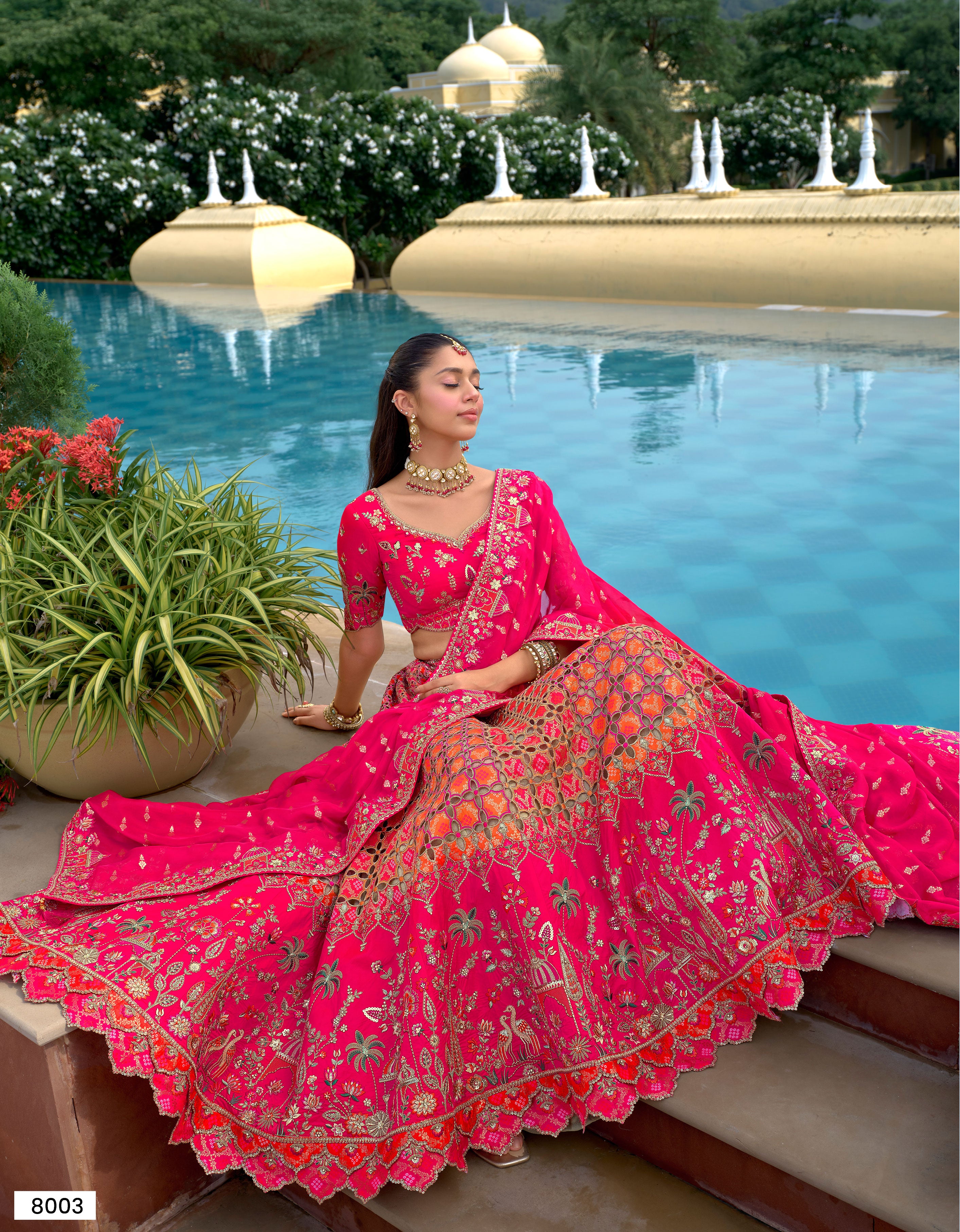 Bright Pink & Orange Embroidered Raw Silk Lehenga Set - 8003