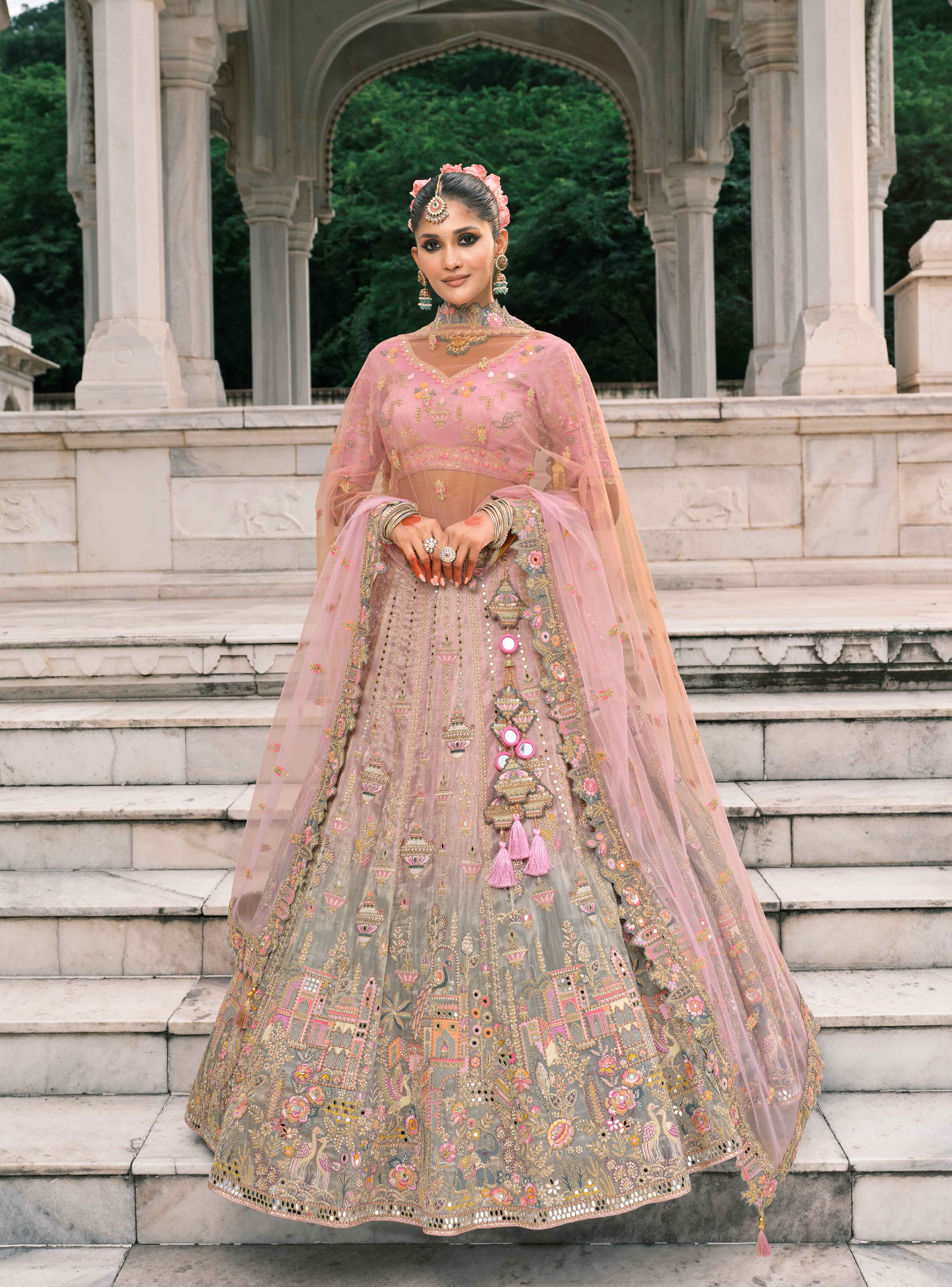 Dusty Pink & Grey Zari Tissue Embroidered Lehenga Set - 7911
