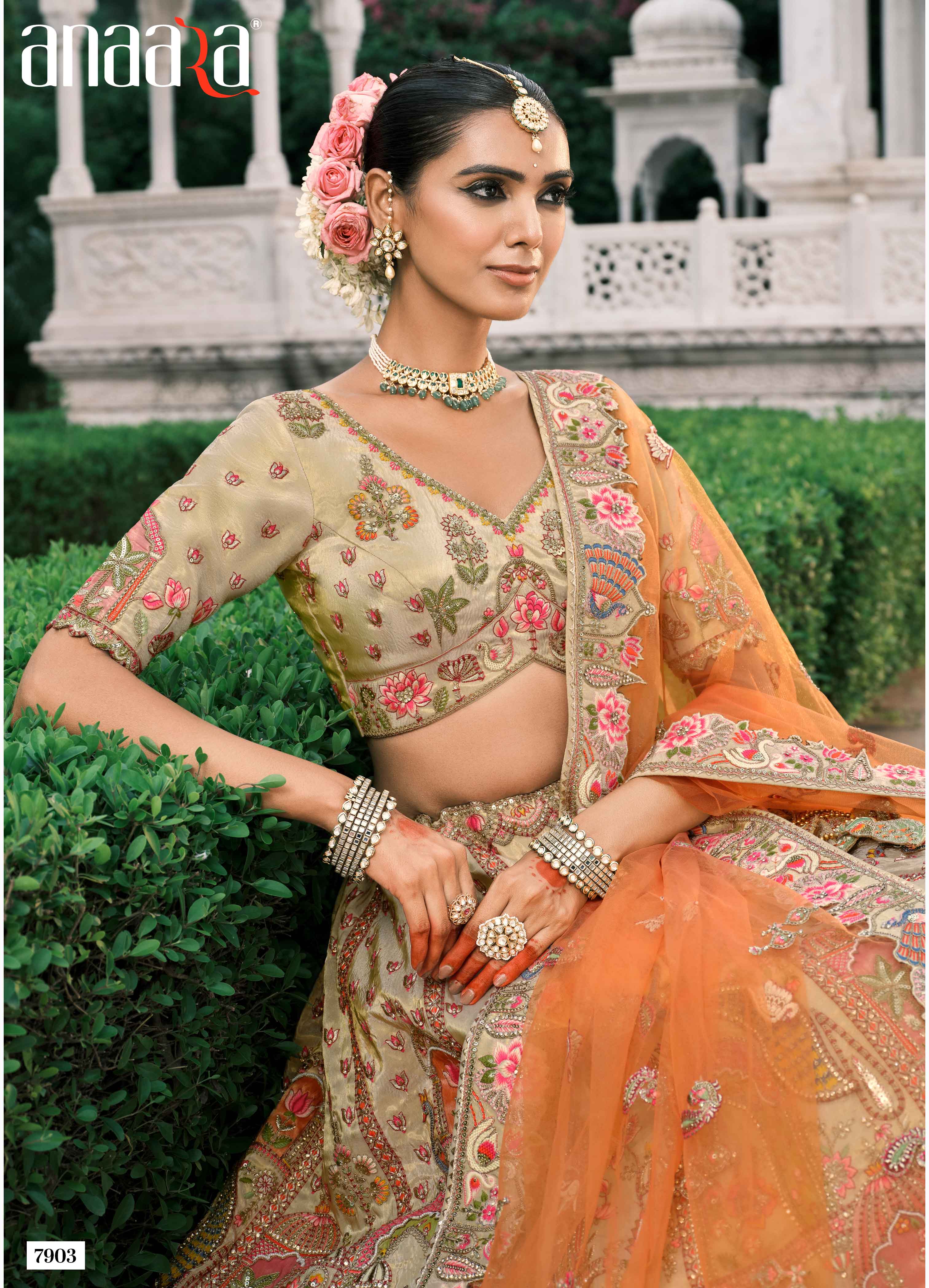 Golden Beige Tissue Zari Embroidered Lehenga Set - 7903