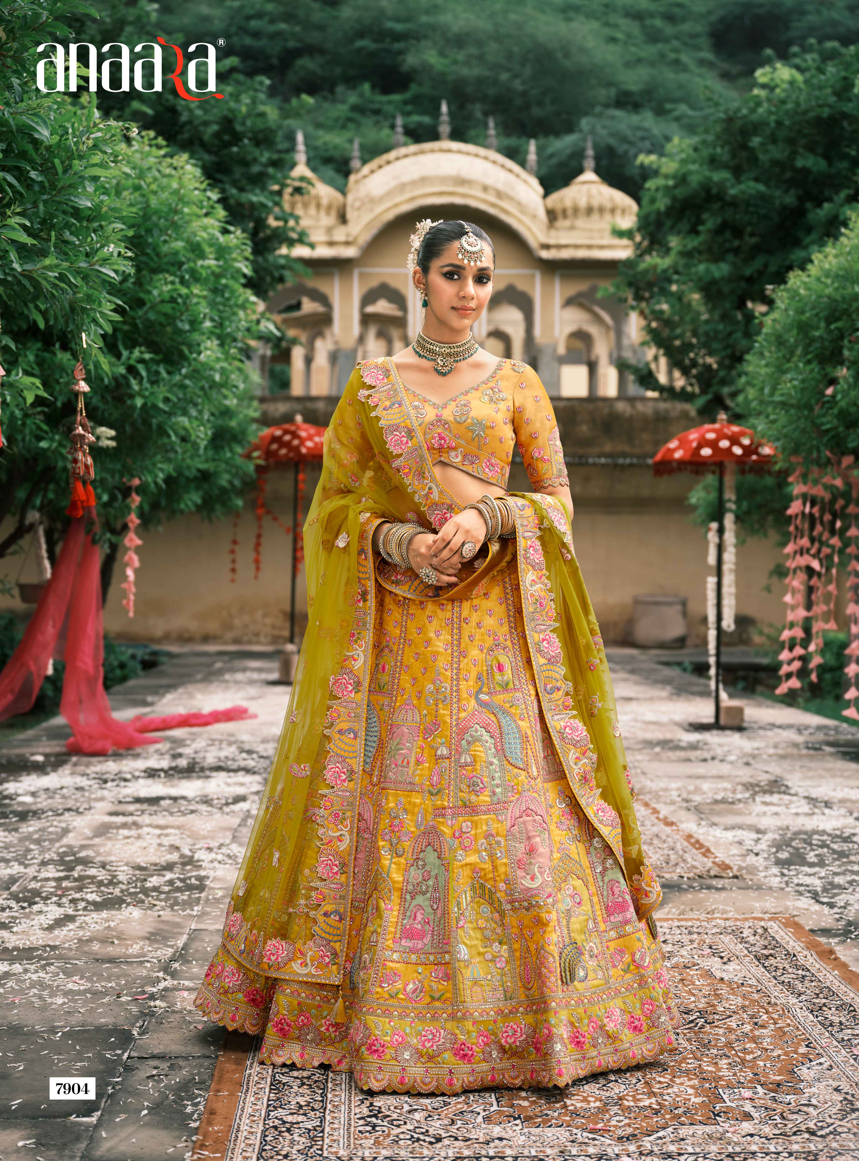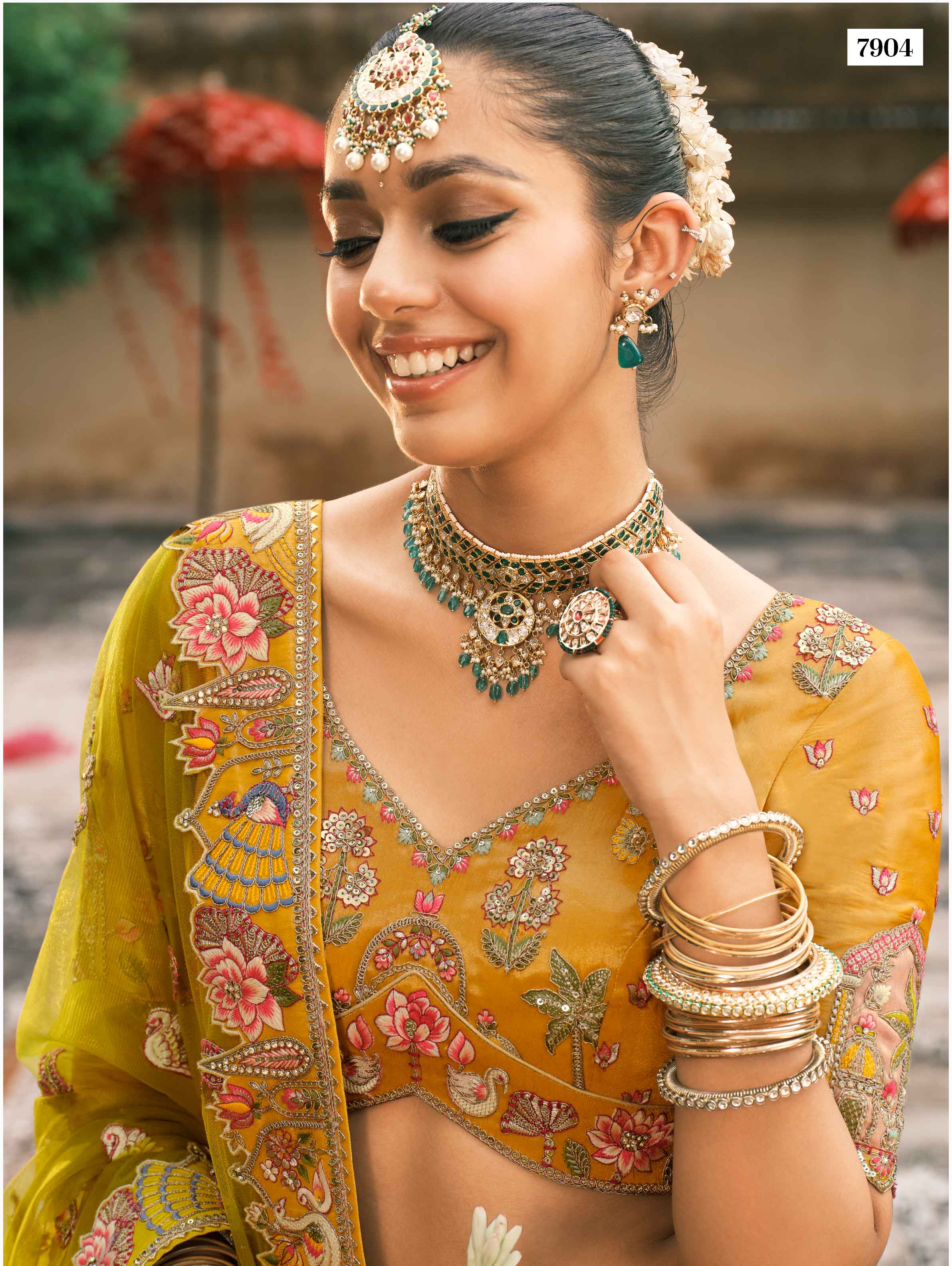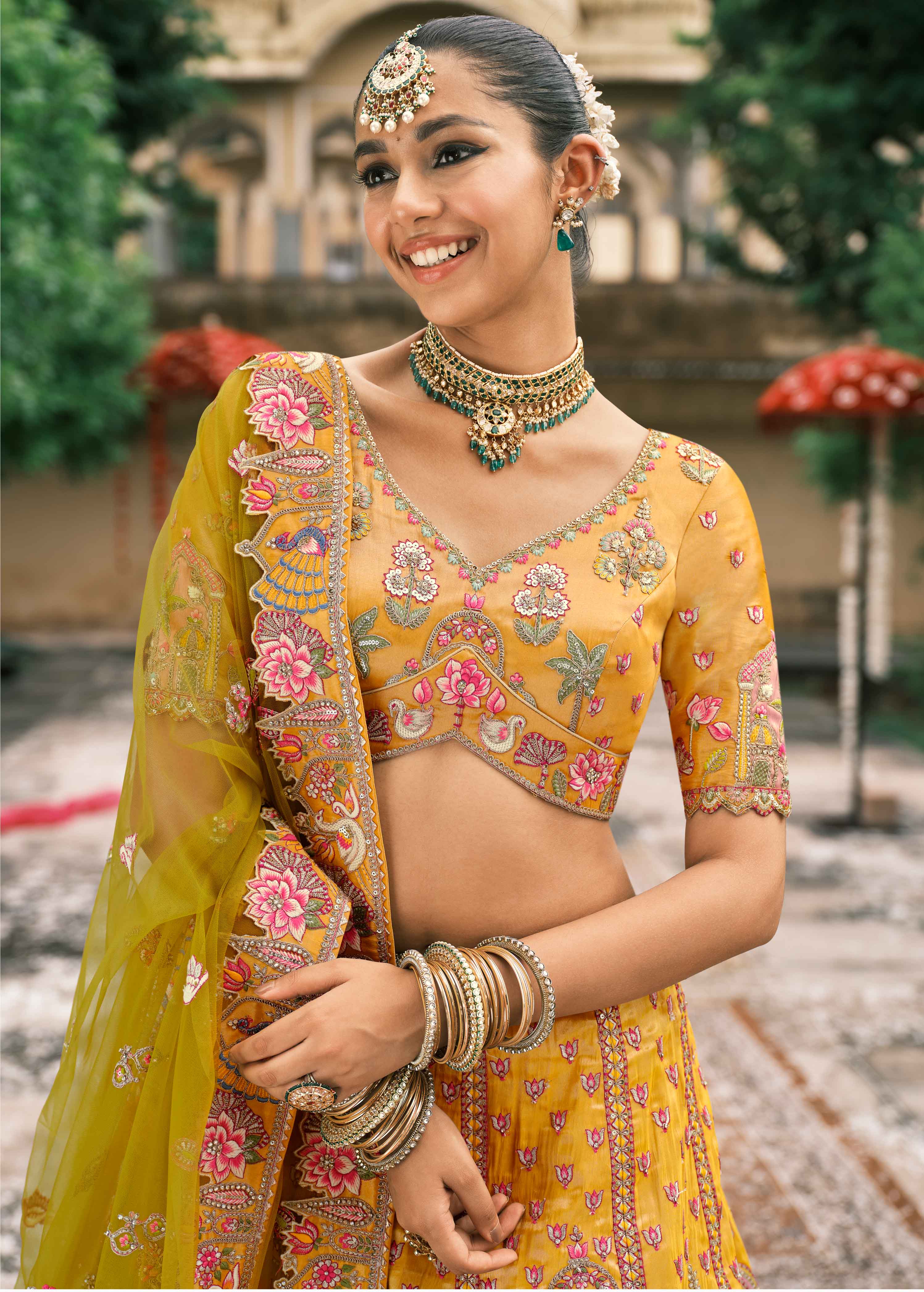 Radiate regal charm with this exquisite mustard yellow lehenga set, crafted in luxurious Tissue Zari fabric. Designed with traditional artistry, this ensemble features intricate embroidery, patchwork, cutwork, and hand detailing, making it perfect for weddings, sangeet celebrations, festivals, and engagement ceremonies. The vibrant olive yellow net dupatta adds a graceful contrast, completing the timeless look.