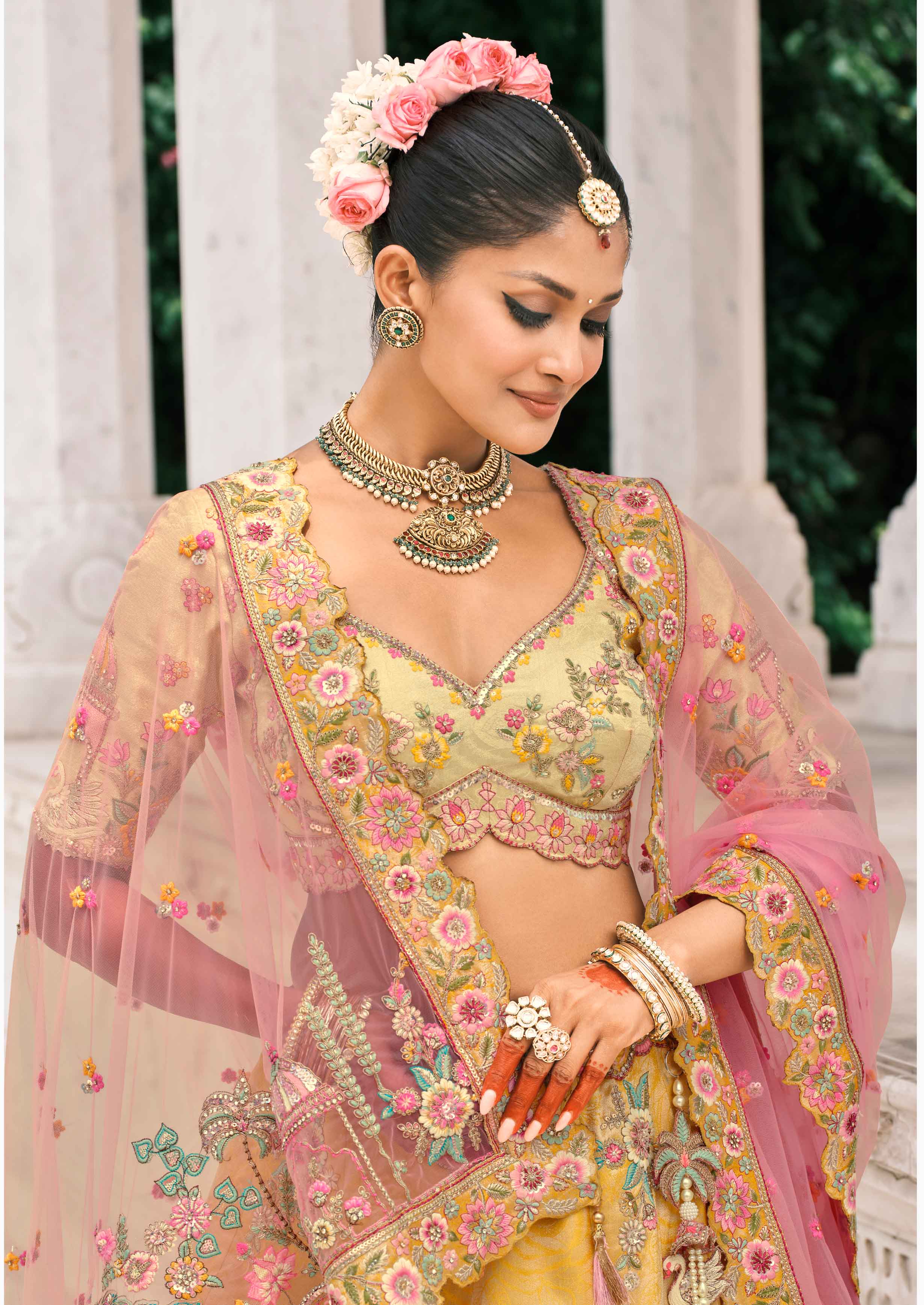 Mustard Yellow Ziraf Viscouse Embroidered Lehenga with Soft Peach-Pink Blouse & Net Dupatta - 7914