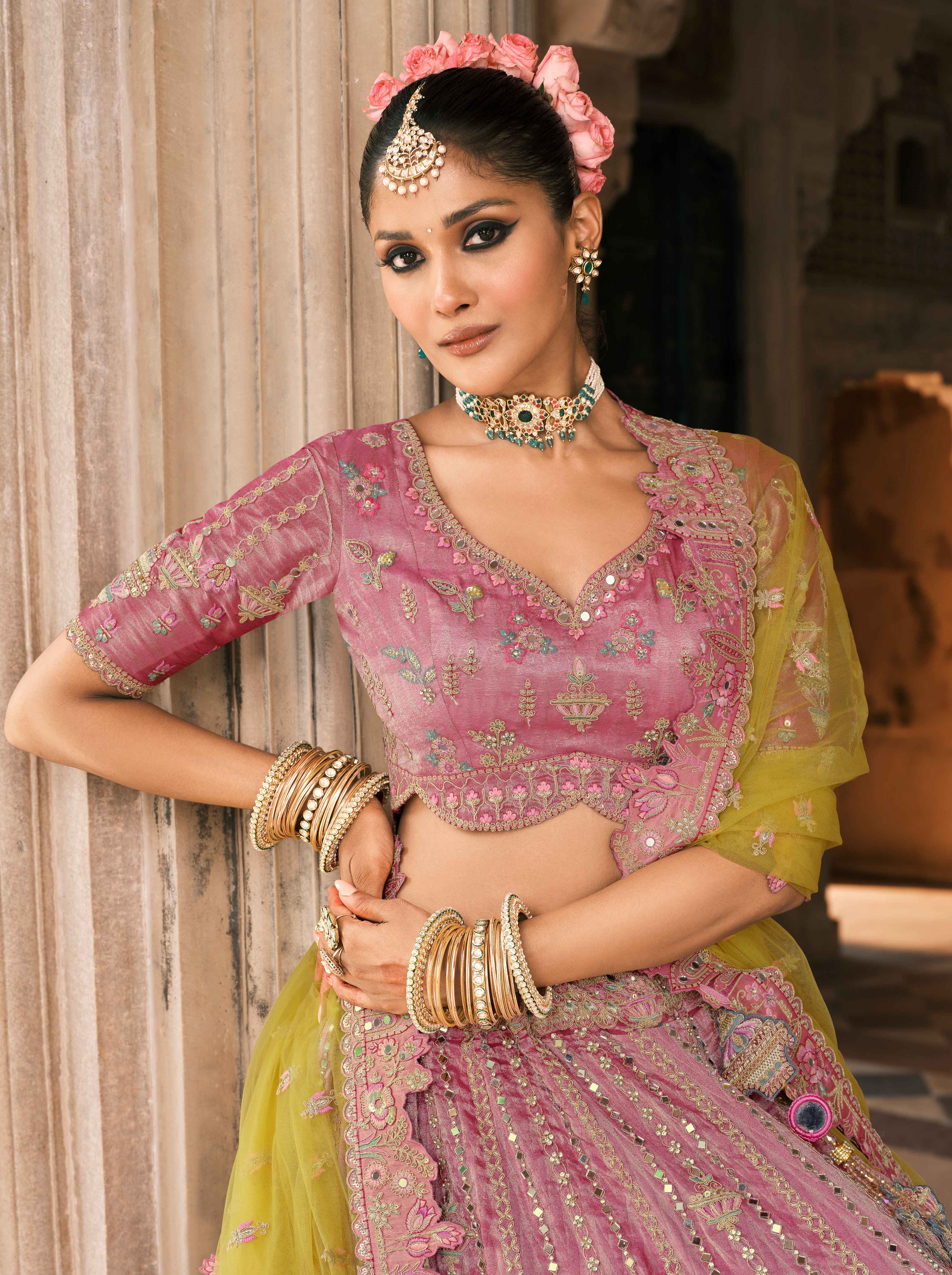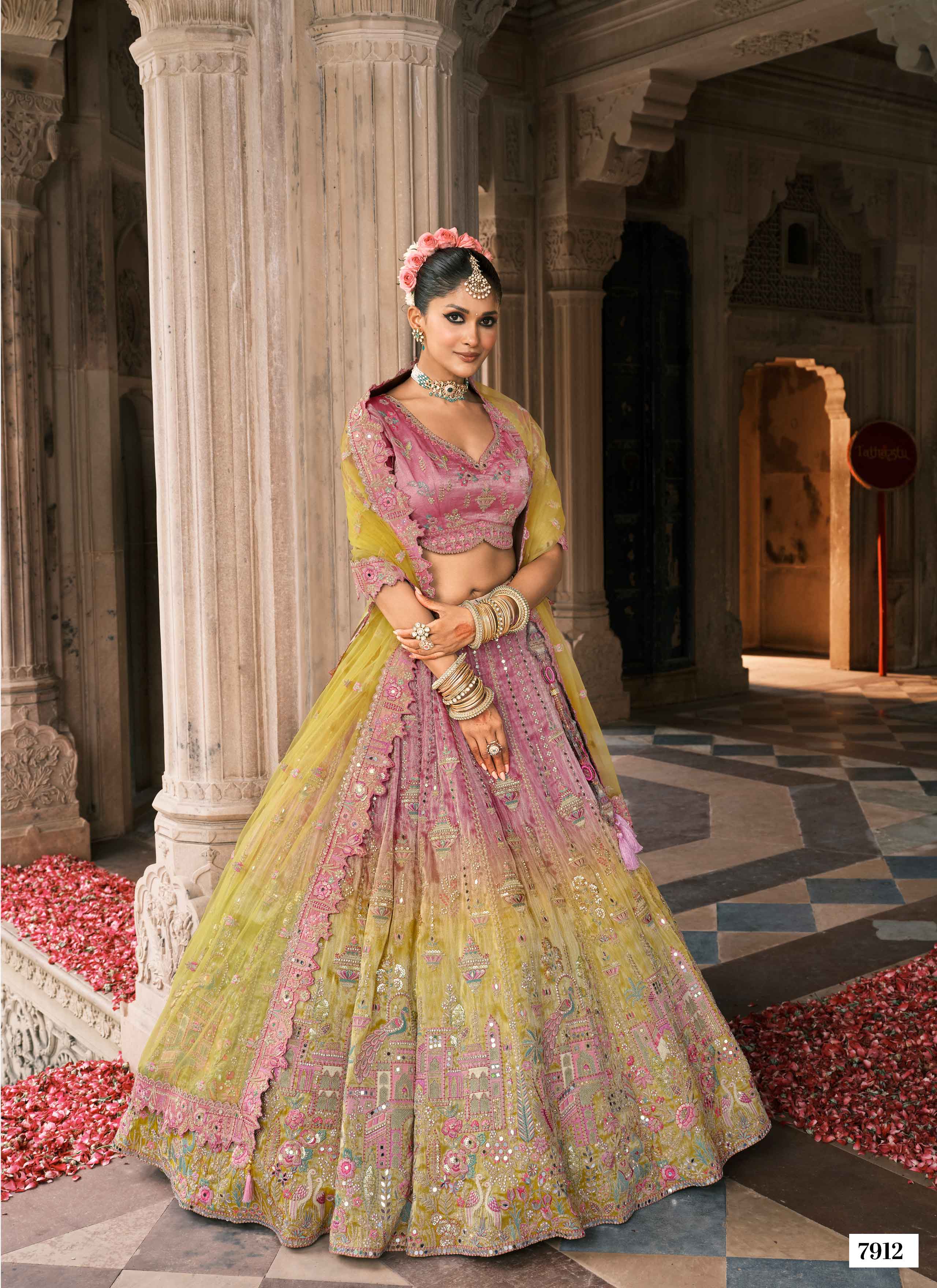 • Lehenga Colour: pastel yellow and dusty pink