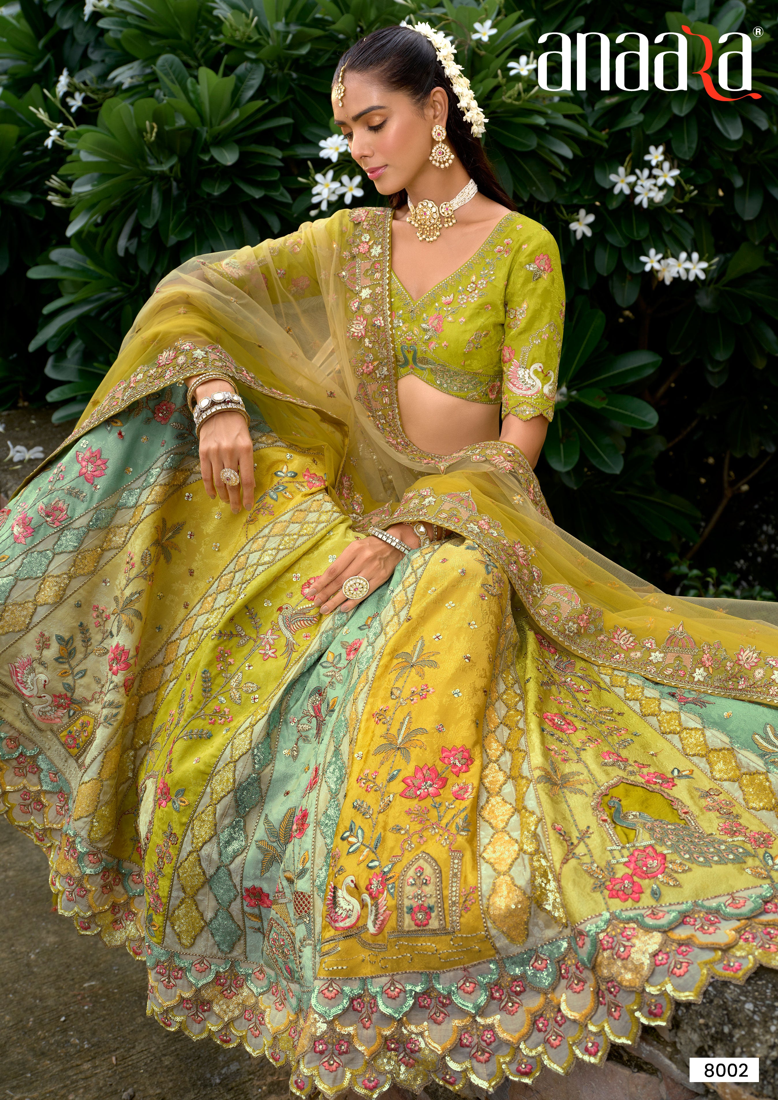 Sage Green and Mustard Yellow Zari Tissue Embroidered Lehenga Set - 8002