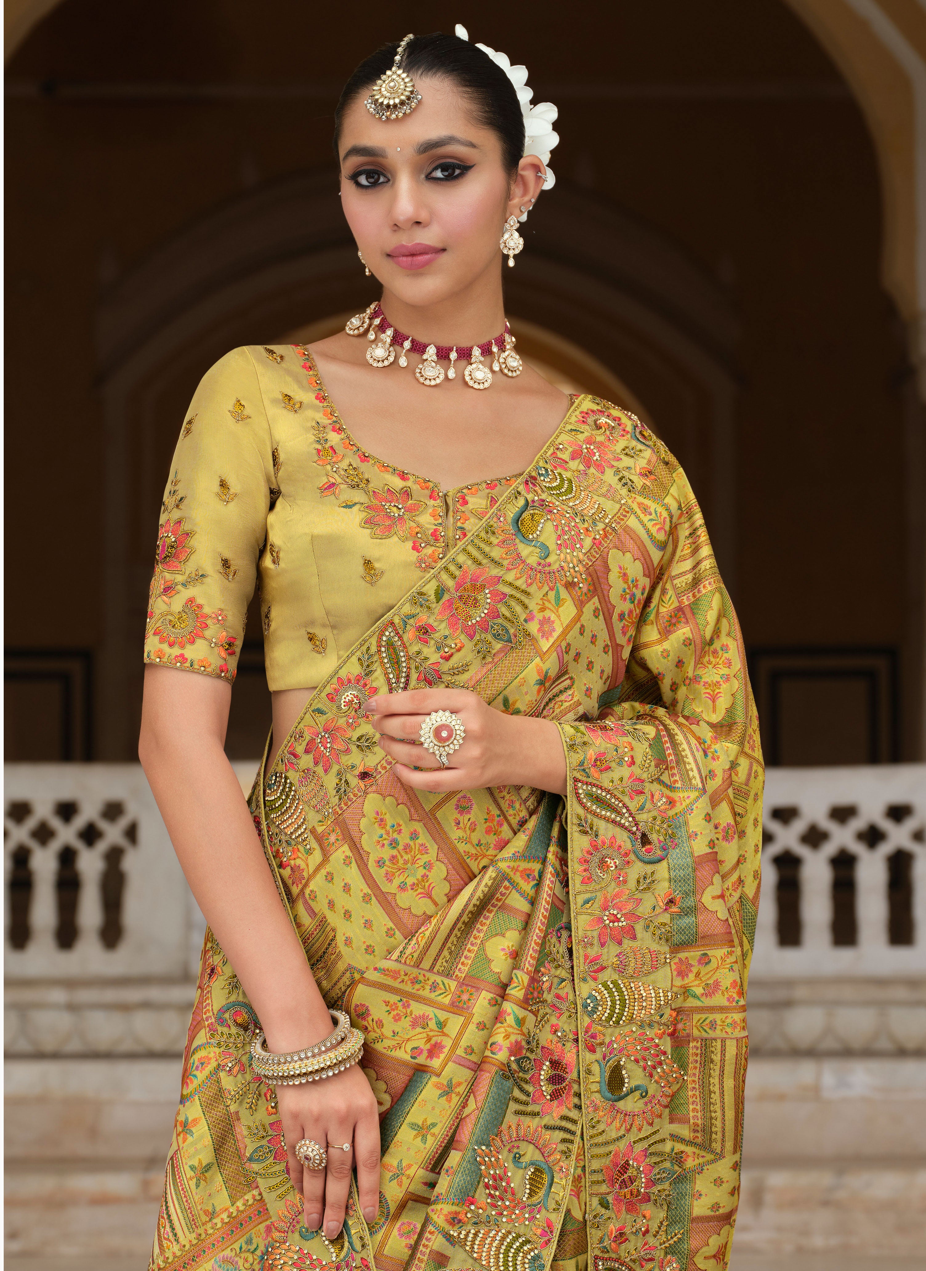 Wrap yourself in heritage luxury with our stunning Kanjiwaram Tissue Saree in a rich Mustard Yellow hue. The saree features intricate embroidered, patch, and handwork detailing, offering a regal finish that makes it ideal for grand celebrations.