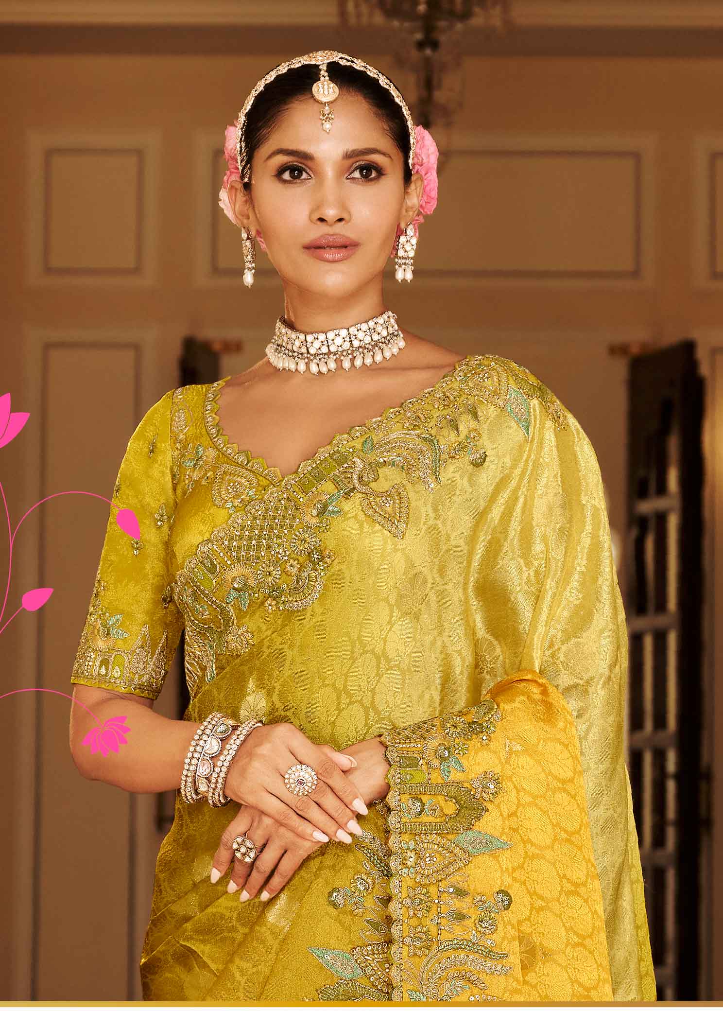 Mustard Yellow & Pastel Green Tissue Satin Traditional Saree with Embroidery & Handwork - 7804