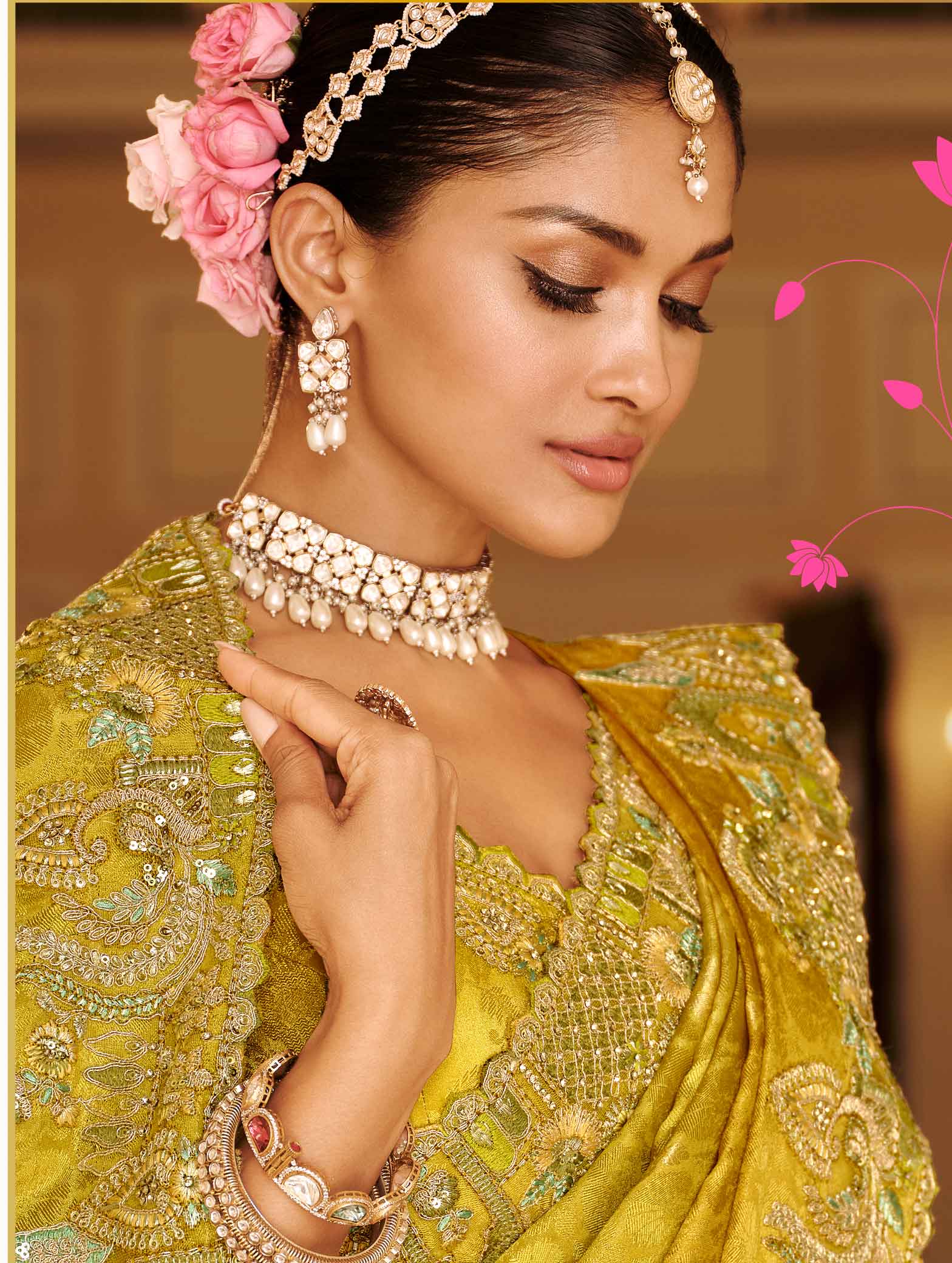 Radiate elegance in this stunning mustard yellow and pastel green tissue satin saree, designed for those who appreciate timeless tradition with a modern touch. Crafted with exquisite embroidery, patchwork, and intricate handwork, this saree is perfect for engagements, weddings, festivals, and sangeet ceremonies.