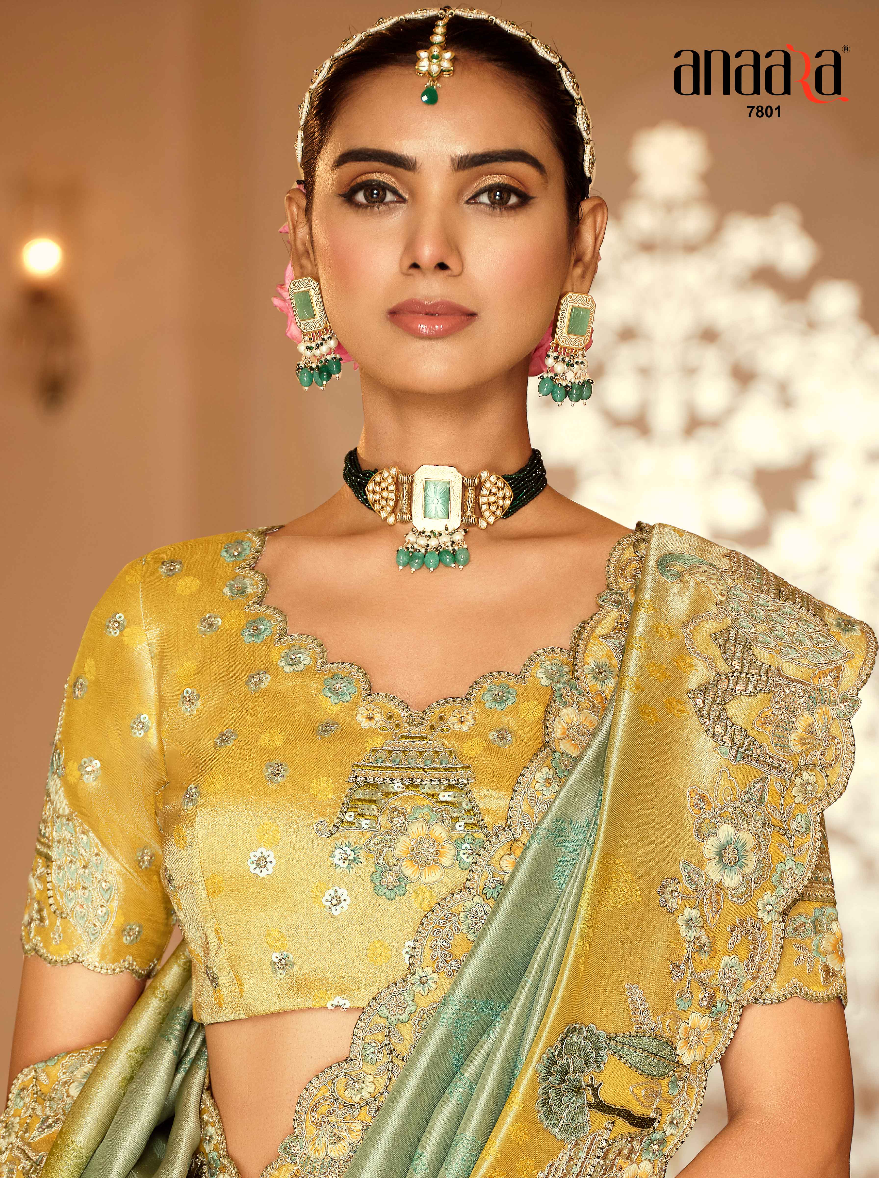 Pastel Green & Mustard Yellow Ziraf Silk Traditional Saree with Embroidery & Handwork - 7801