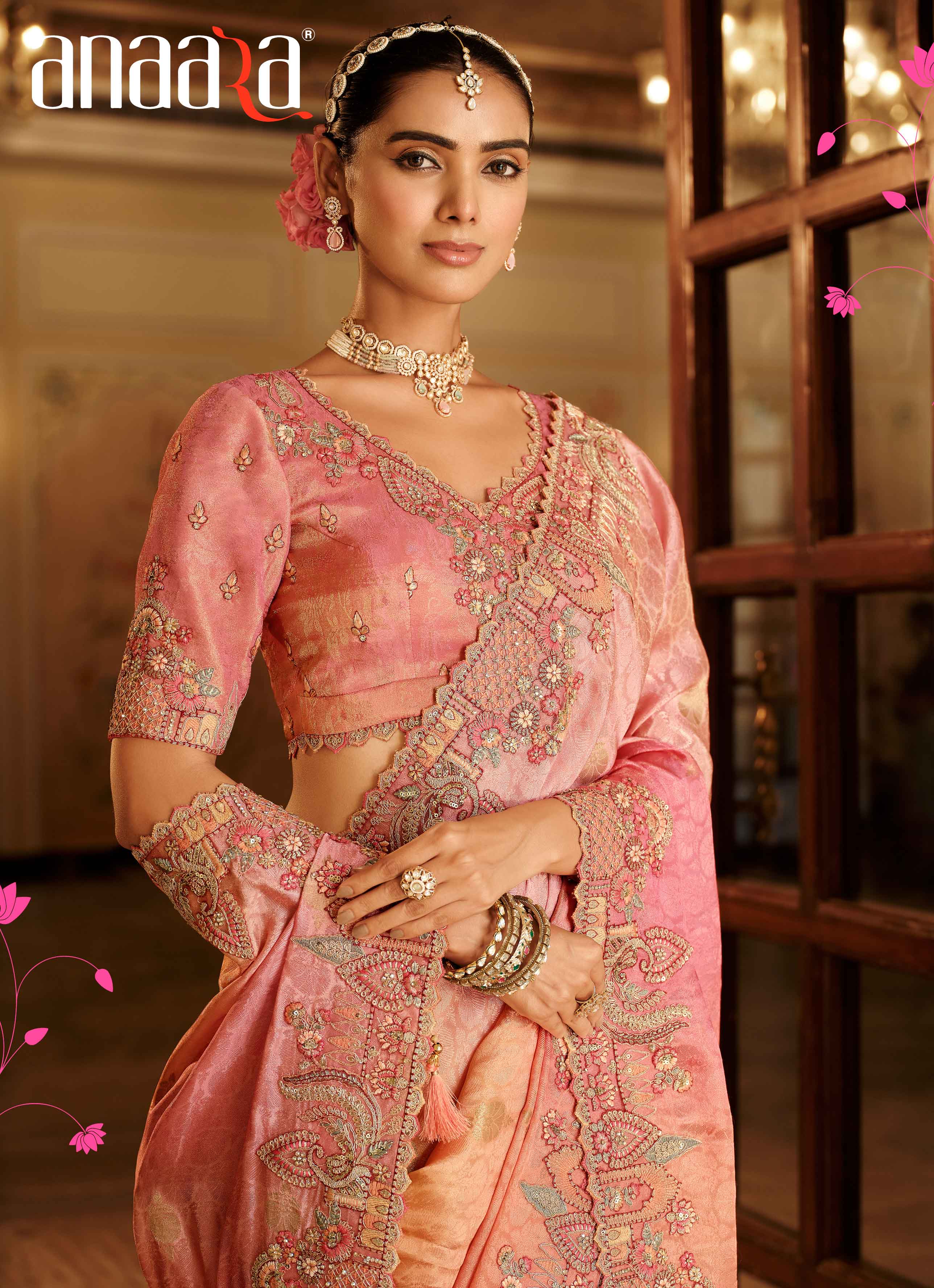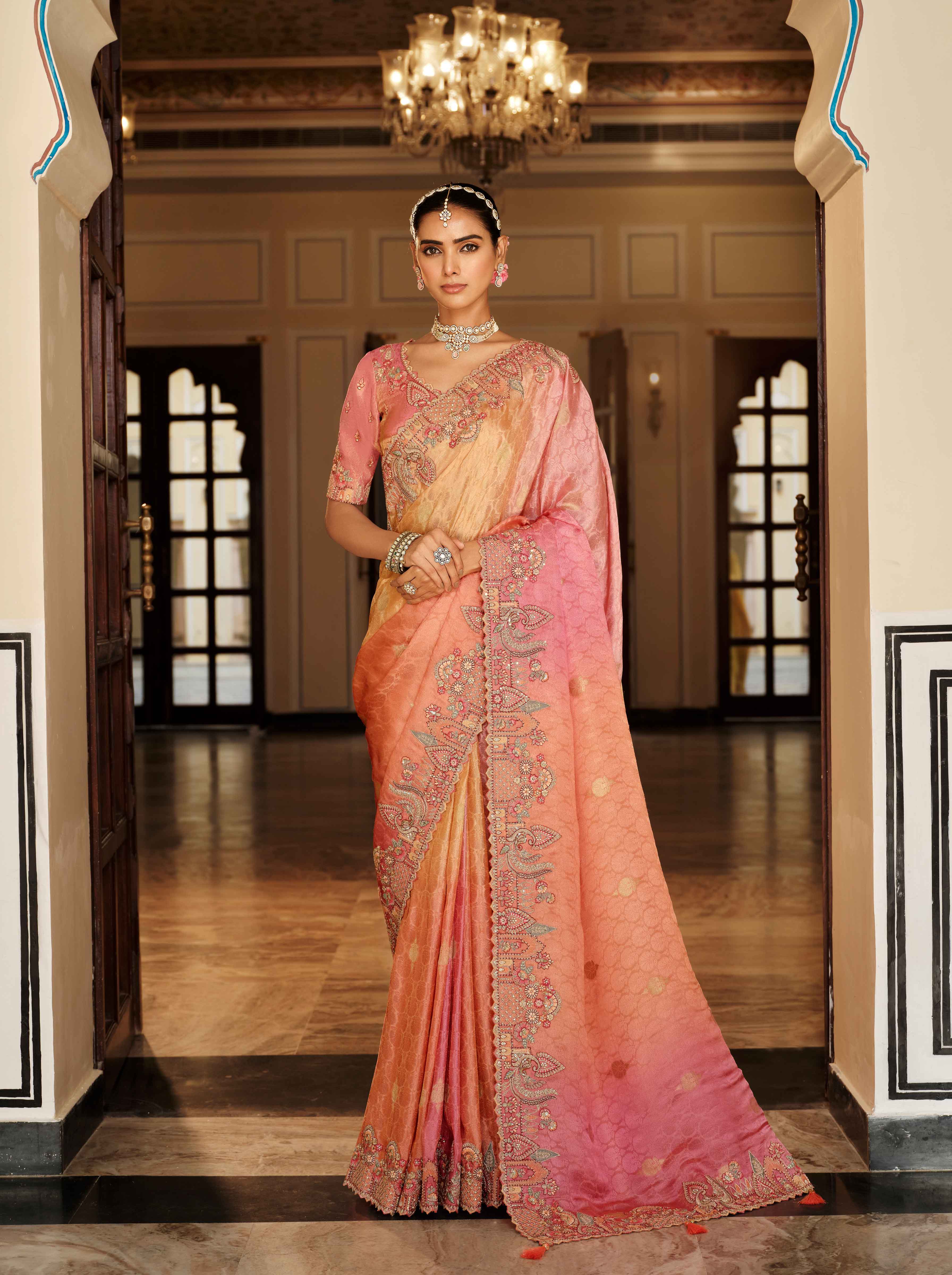 Peach, Coral Orange & Pink Tissue Satin Traditional Saree with Embroidery & Handwork - 7803