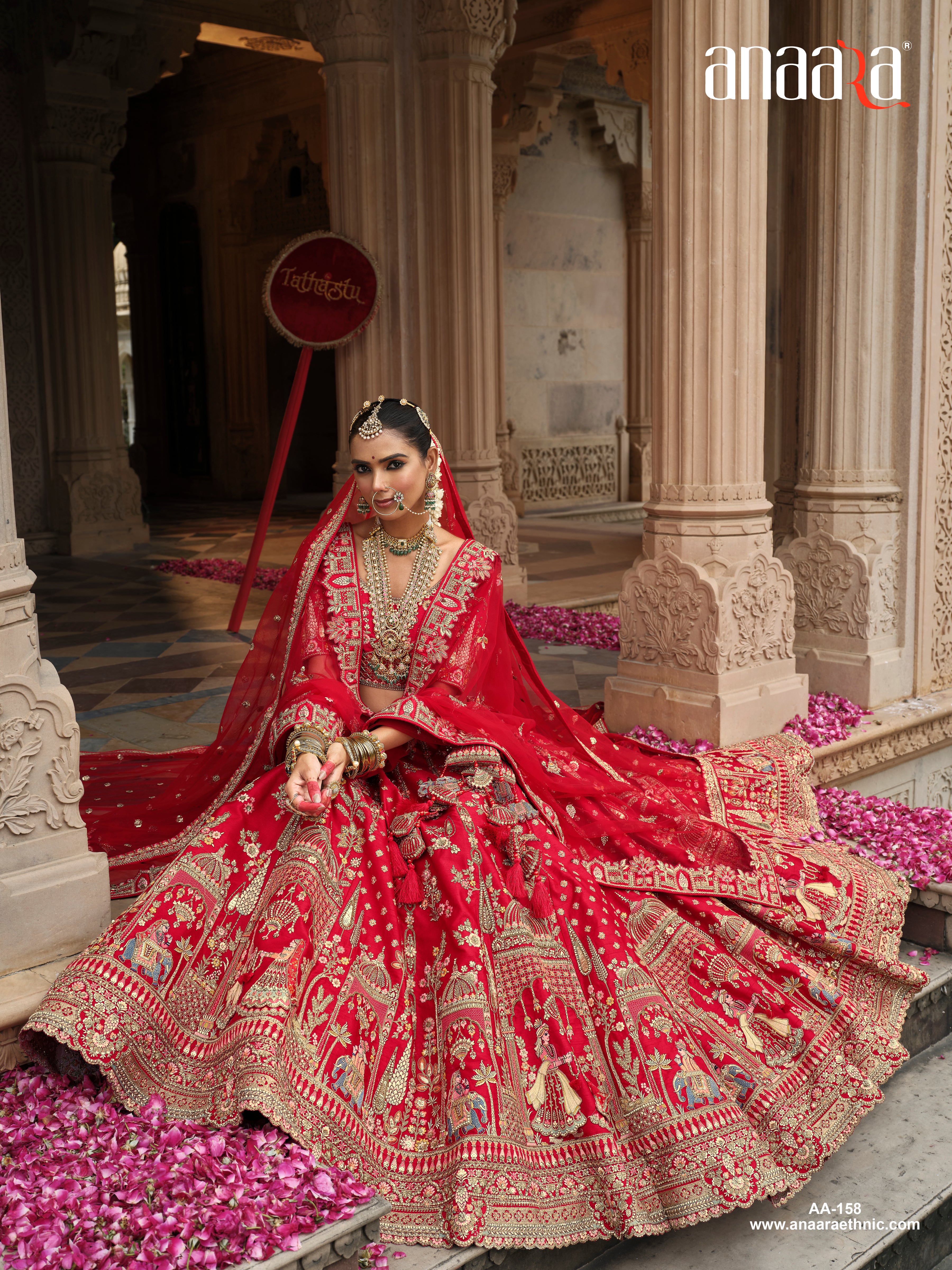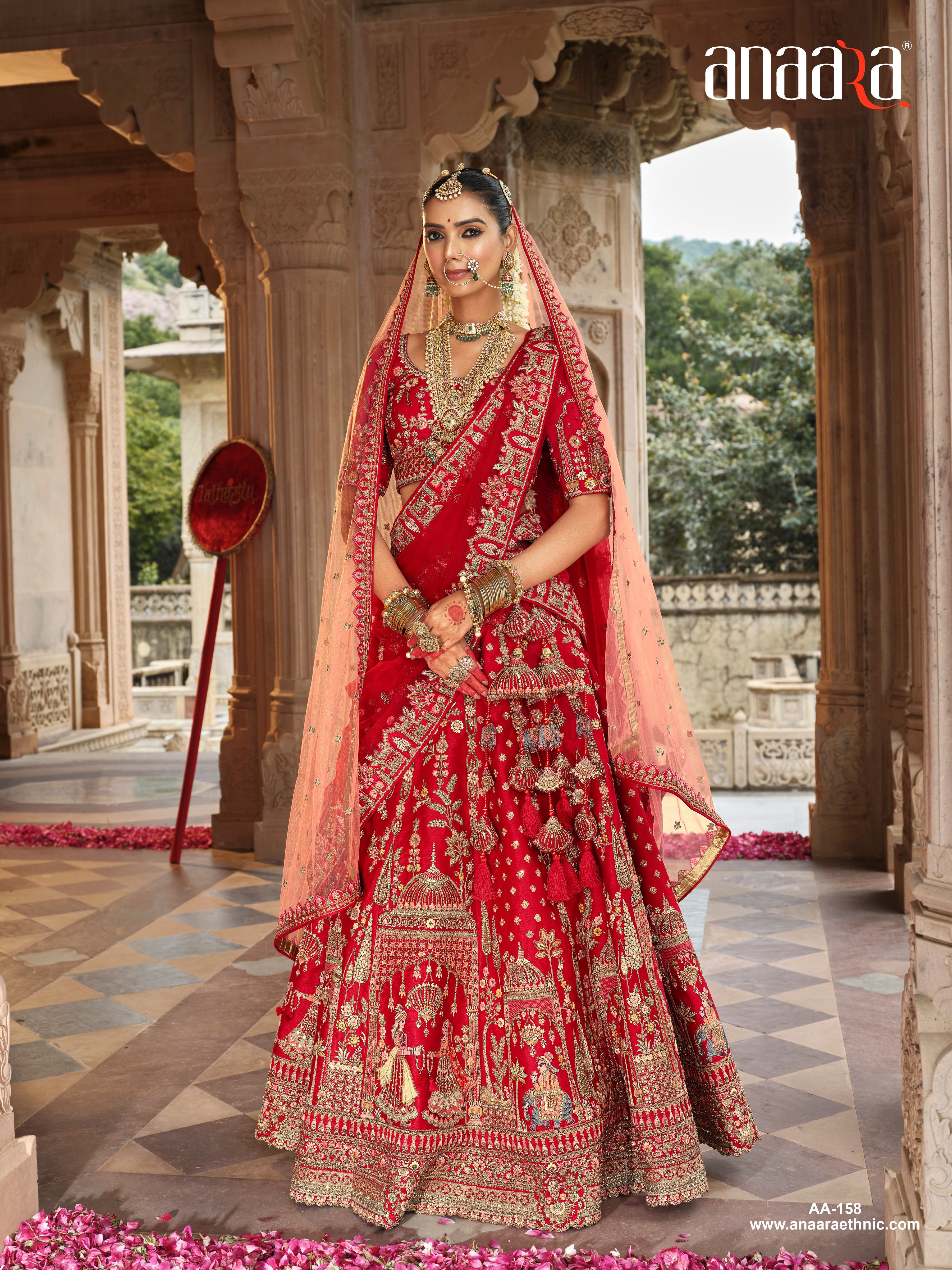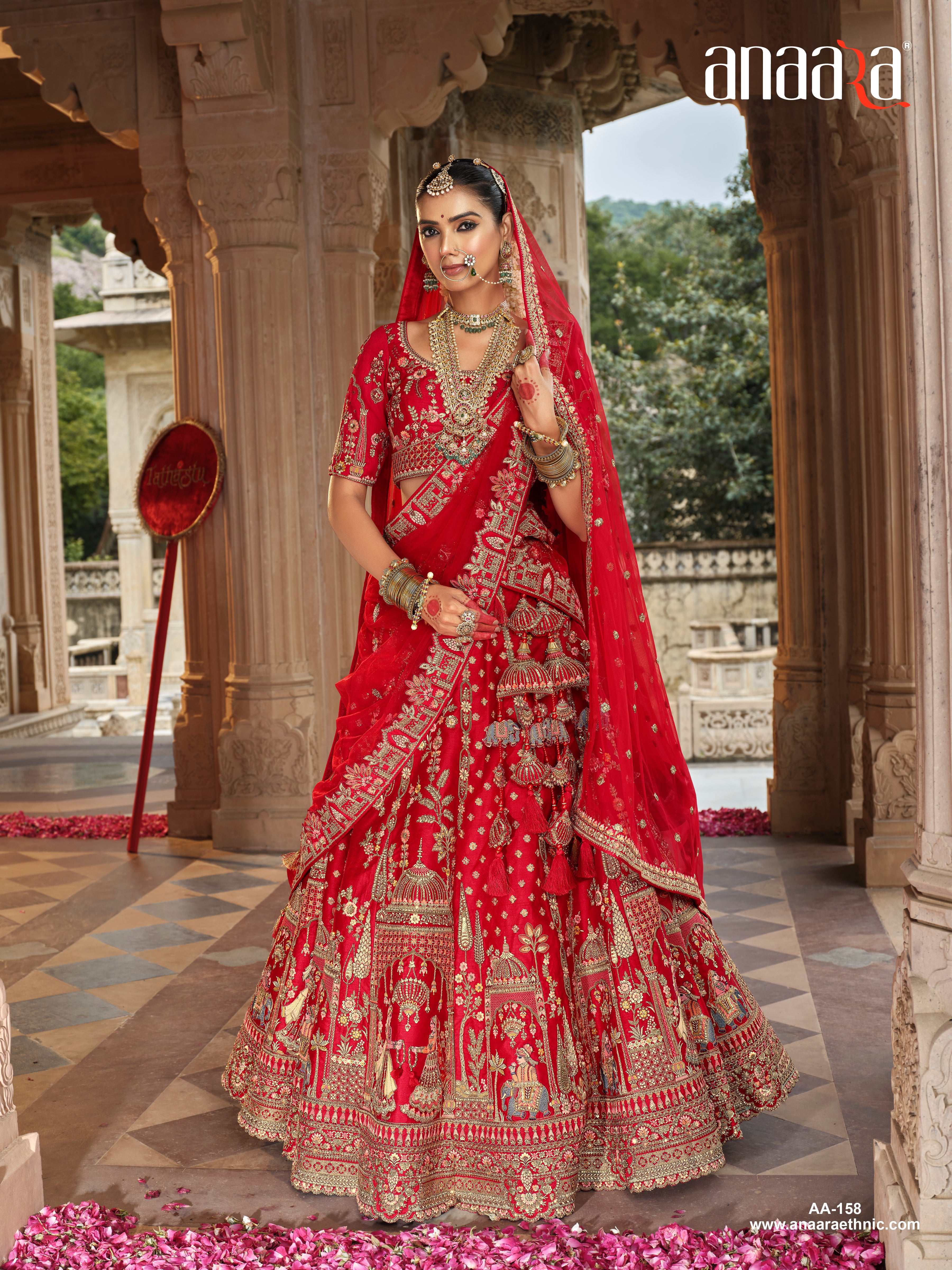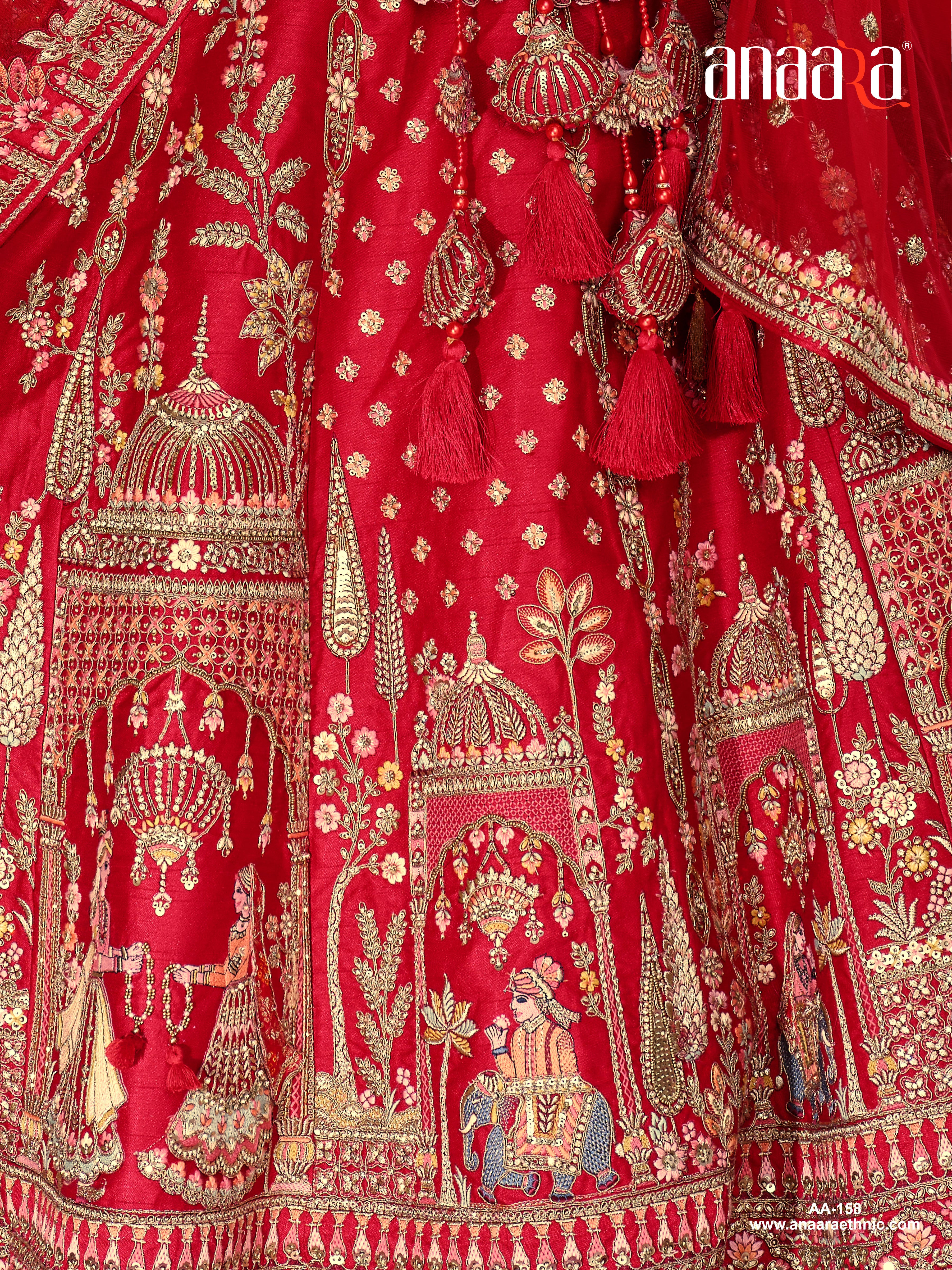 Khatli Embroidered Bright Red Silk Bridal Lehenag Choli - AA158