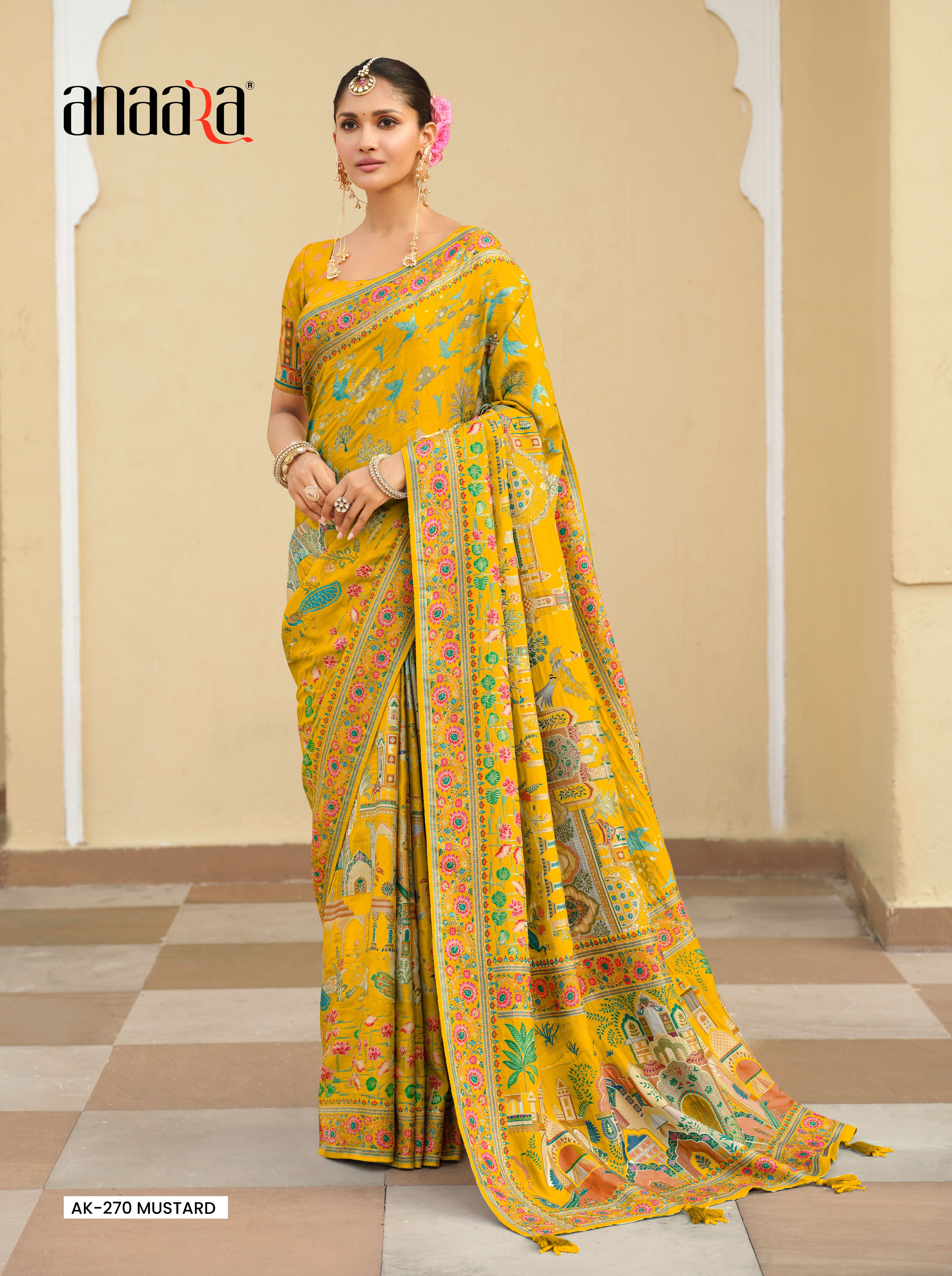 Elevate your festive wardrobe with this elegant Mustard Yellow Dolla Saree, designed to reflect timeless tradition with contemporary charm. Featuring intricate position prints and a harmonious color palette, this saree is perfect for weddings, festive gatherings, and special celebrations.