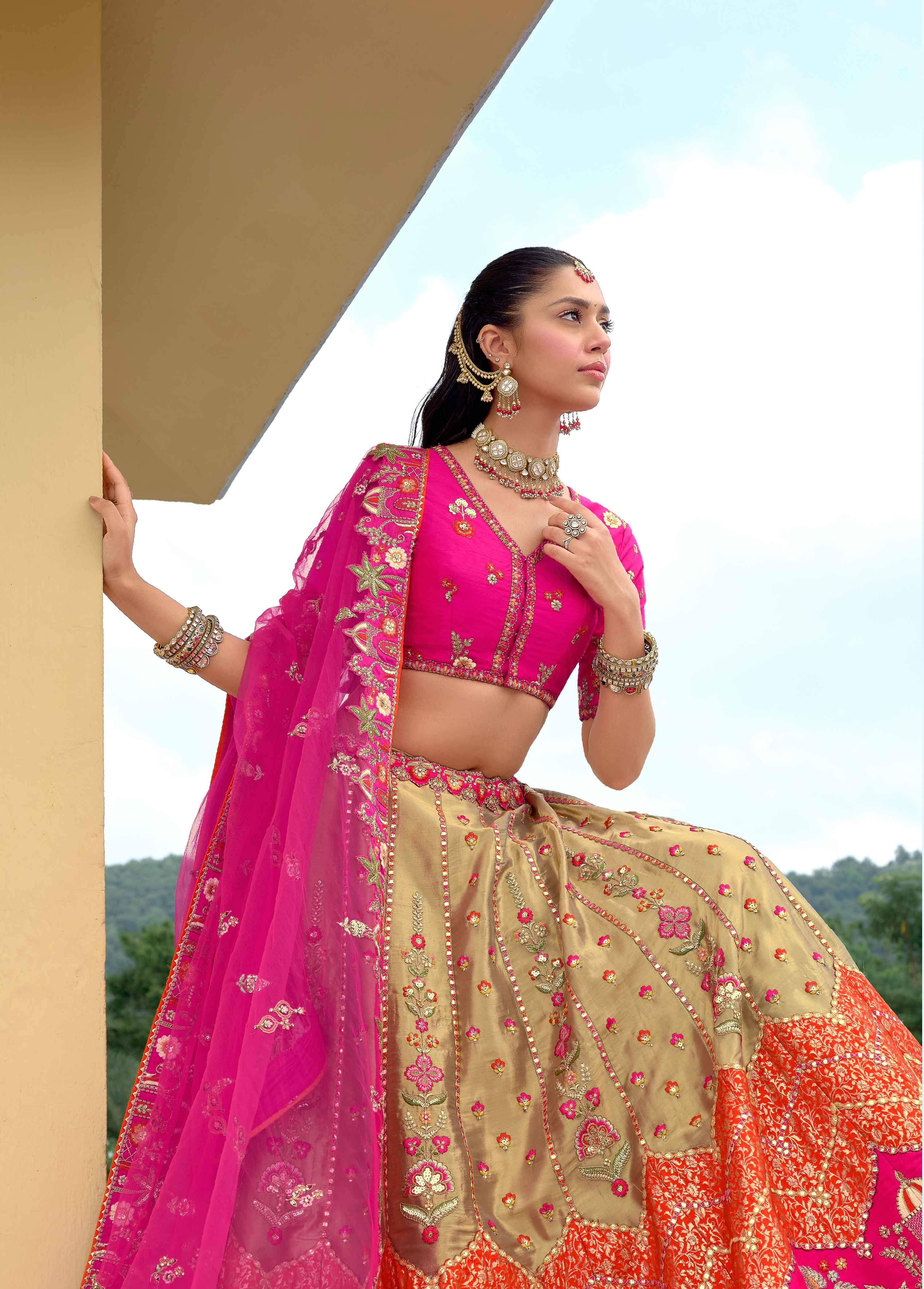 Rani Pink & Cream Silk Cut Work & Mirror Work Bridal Lehenga Choli - 8010